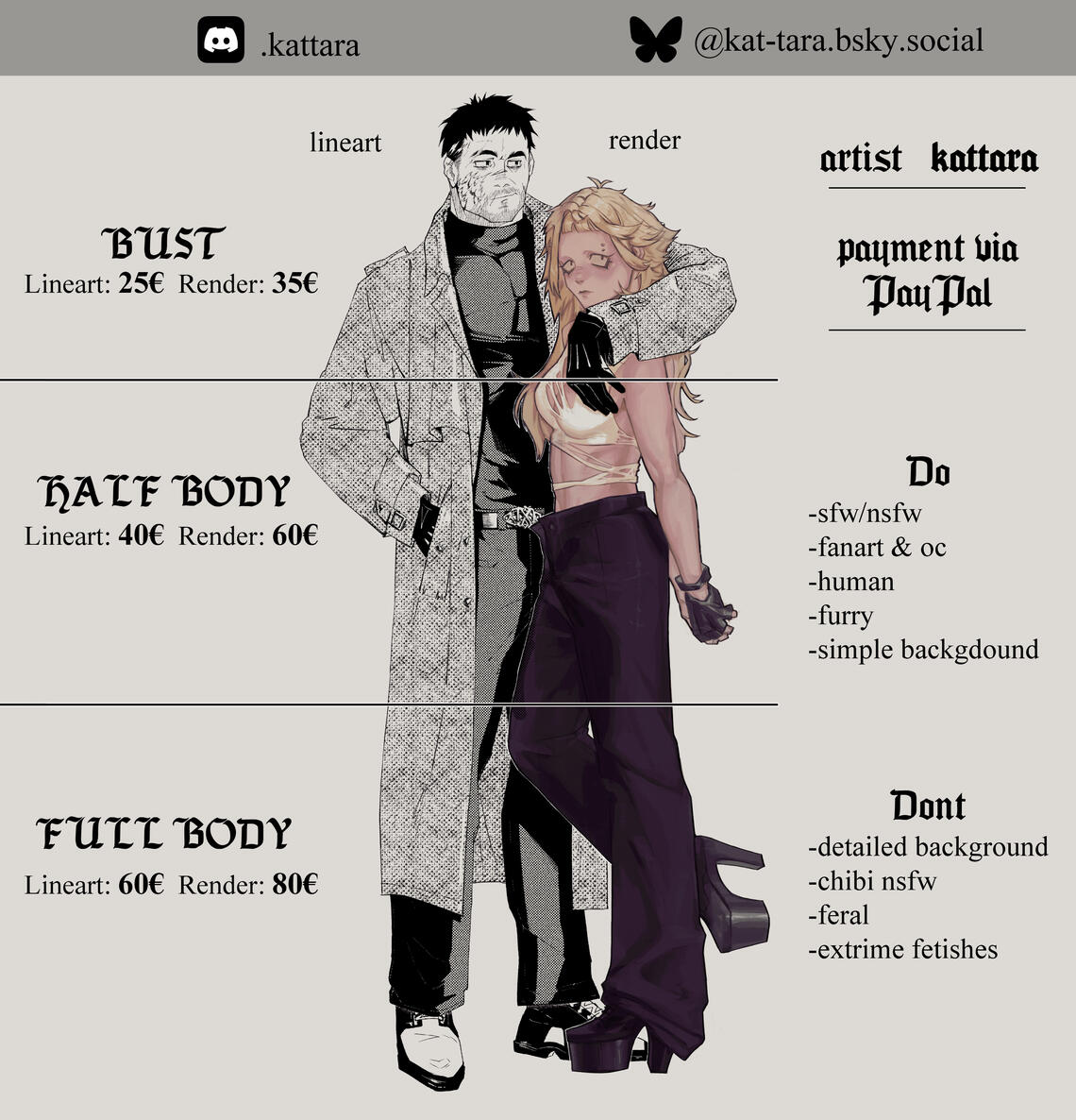 ⭑ I accept payment only via Paypal⭑ I'll take 100% payment in advance⭑ No refunds or holds⭑ Extra characters are 100% of the original price⭑ Deadline is 1 to 3 weeks depending on the workload!⭑ If you want your comm to be a priority on my list, you can pay a 20% fee⭑ If you want an artwork by a certain expedited deadline, you have to pay extra (20% fee) and tell me before I accept the commission!⭑ You can only do changes in the sketch. Changes in the coloring stages that are not about colors WILL COST EXTRA ^^⭑ I may refuse to do the work BEFORE payment if it is unpleasant to me or you edit it too much (more than 5 edits)